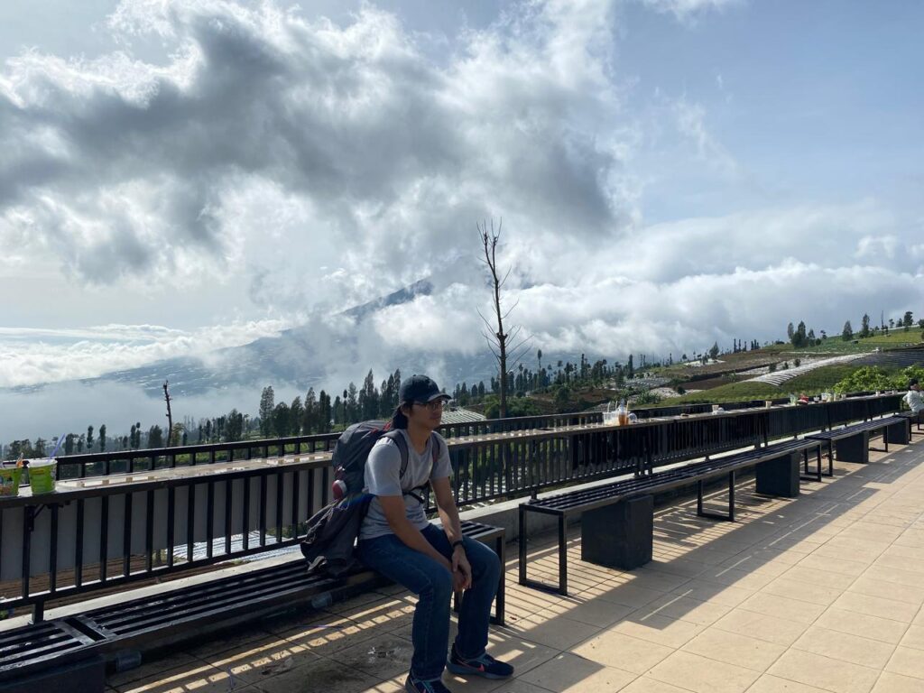 Sayangnya waktu itu lagi mendung, jadi yang kelihatan paling jelas cuma Gunung Sumbing. Sisanya malu-malu ketutup awan putih. Tapi justru itu yang bikin suasananya berasa banget kayak lagi jalan di atas awan.